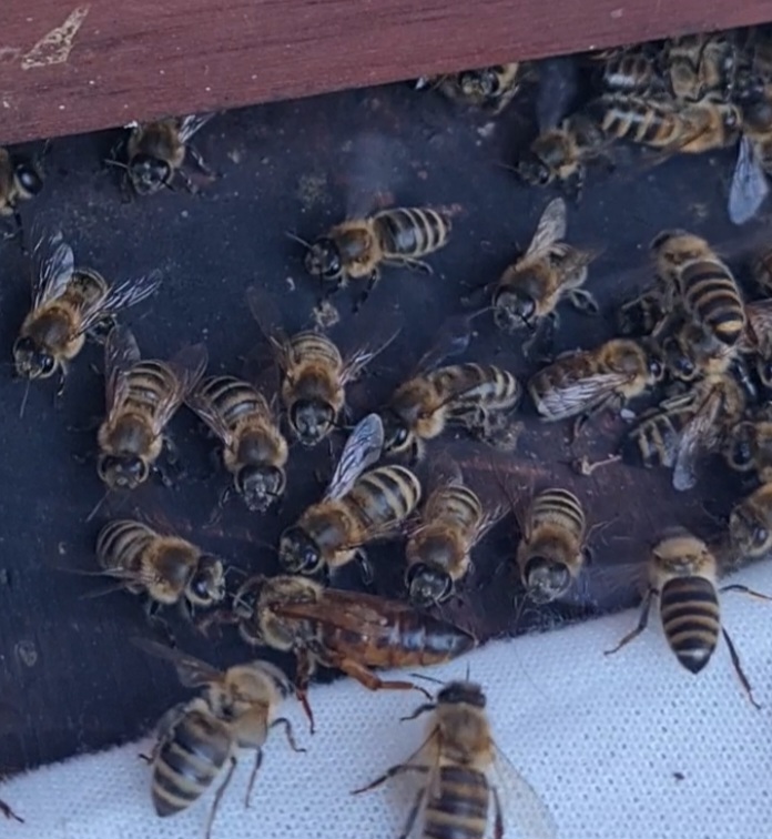 Und so hab ich herausgefunden, dass es im oberen Bereich ordentlich Versteck Möglichkeiten gab und auch eine Stelle, an der sie an dem Karton vorbei nach draußen kamen. Als mir nach 30 min der Rauch ausging, waren zwar einige Bienen im Kasten, doch die Königin vermutlich nicht. Weshalb ich den Karton nach einer Stunde ausgekippt habe und einen Mini Einlauf durchgeführt.