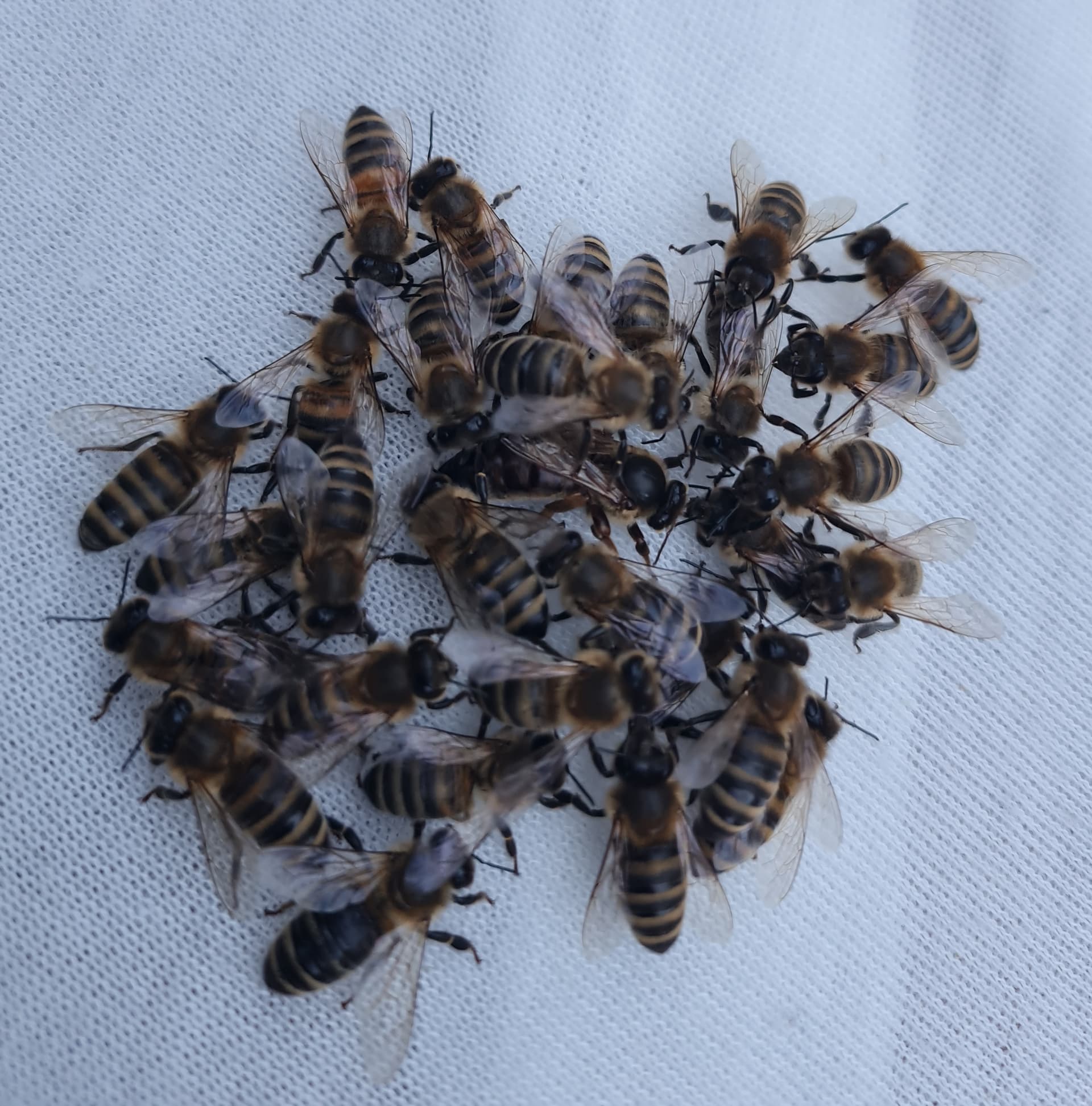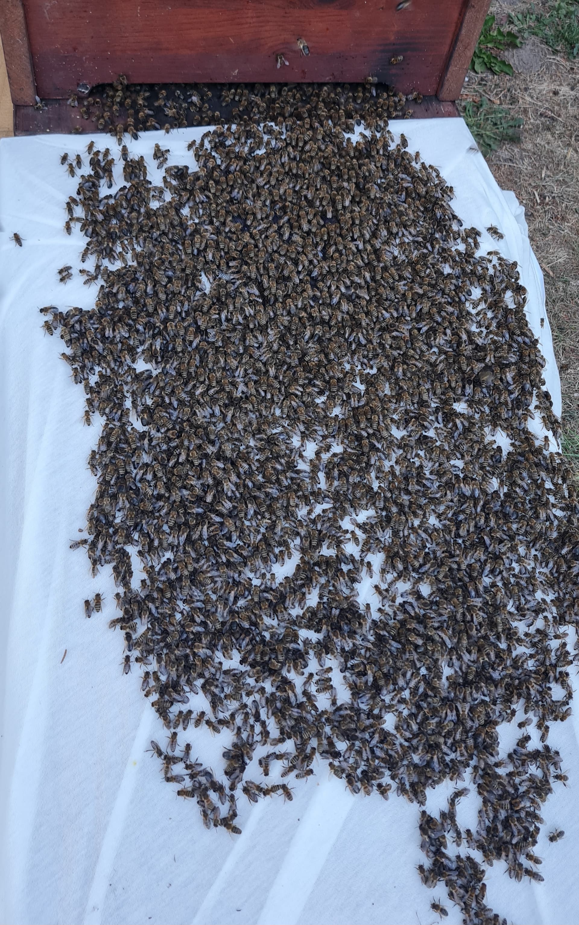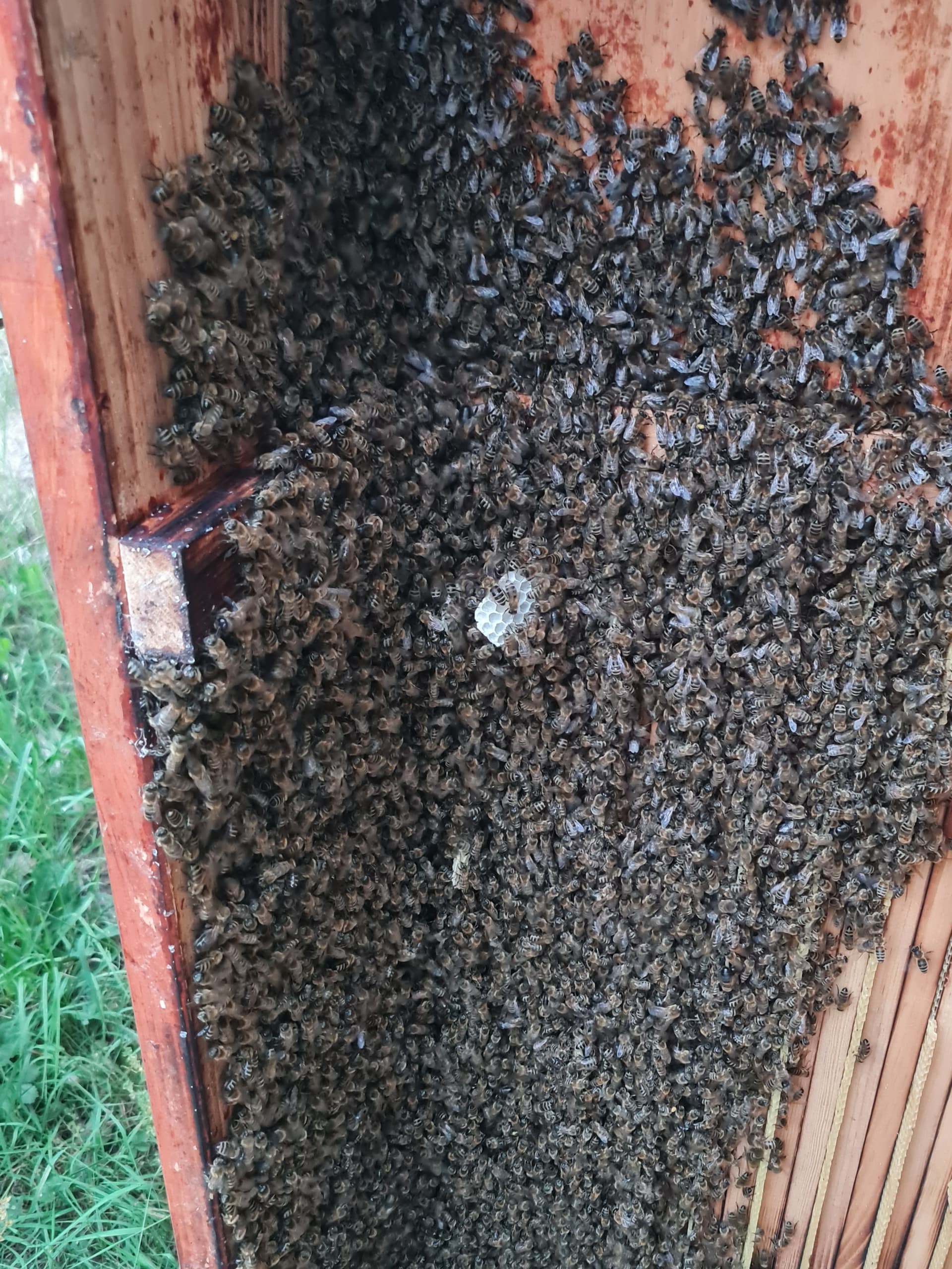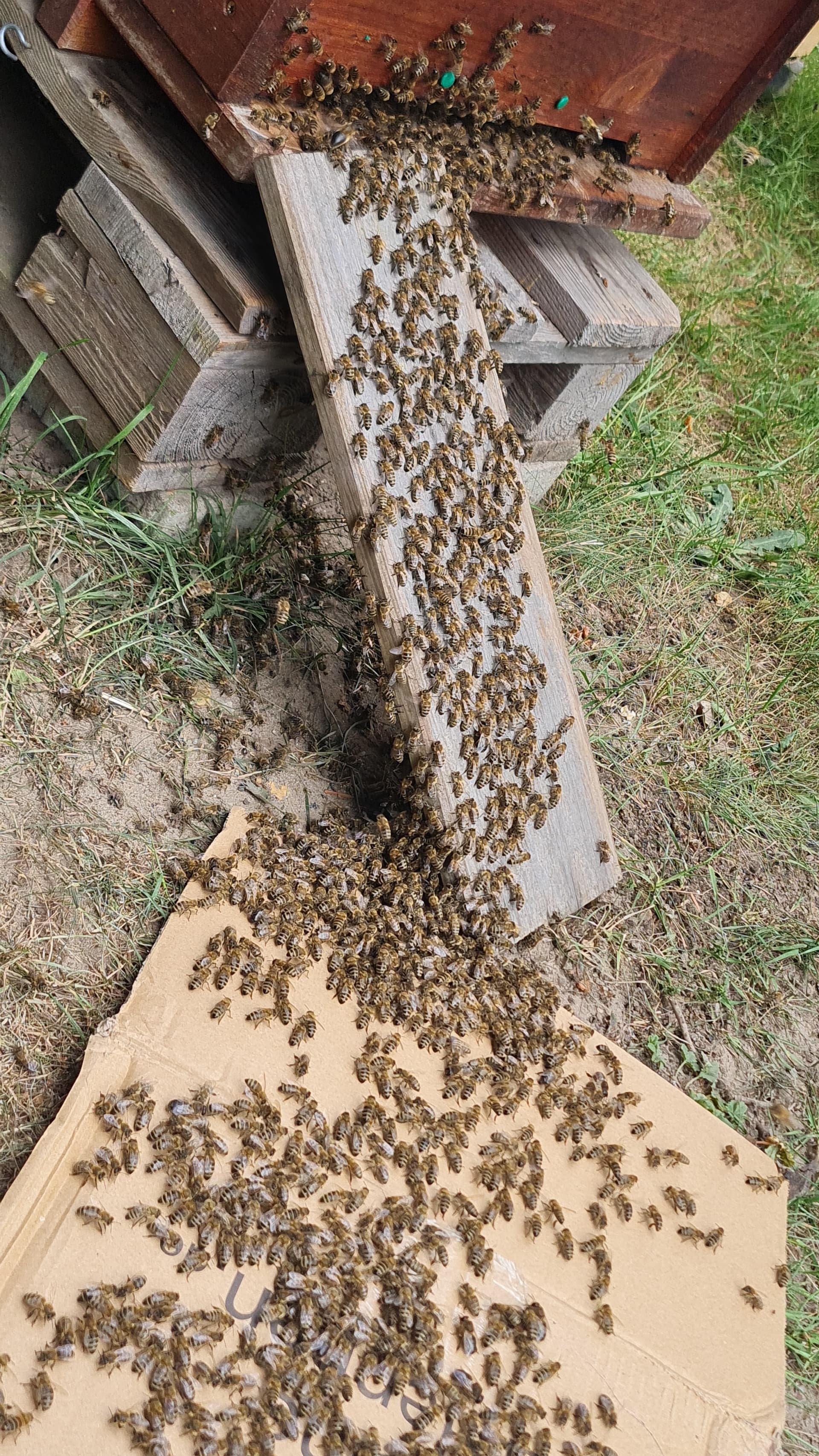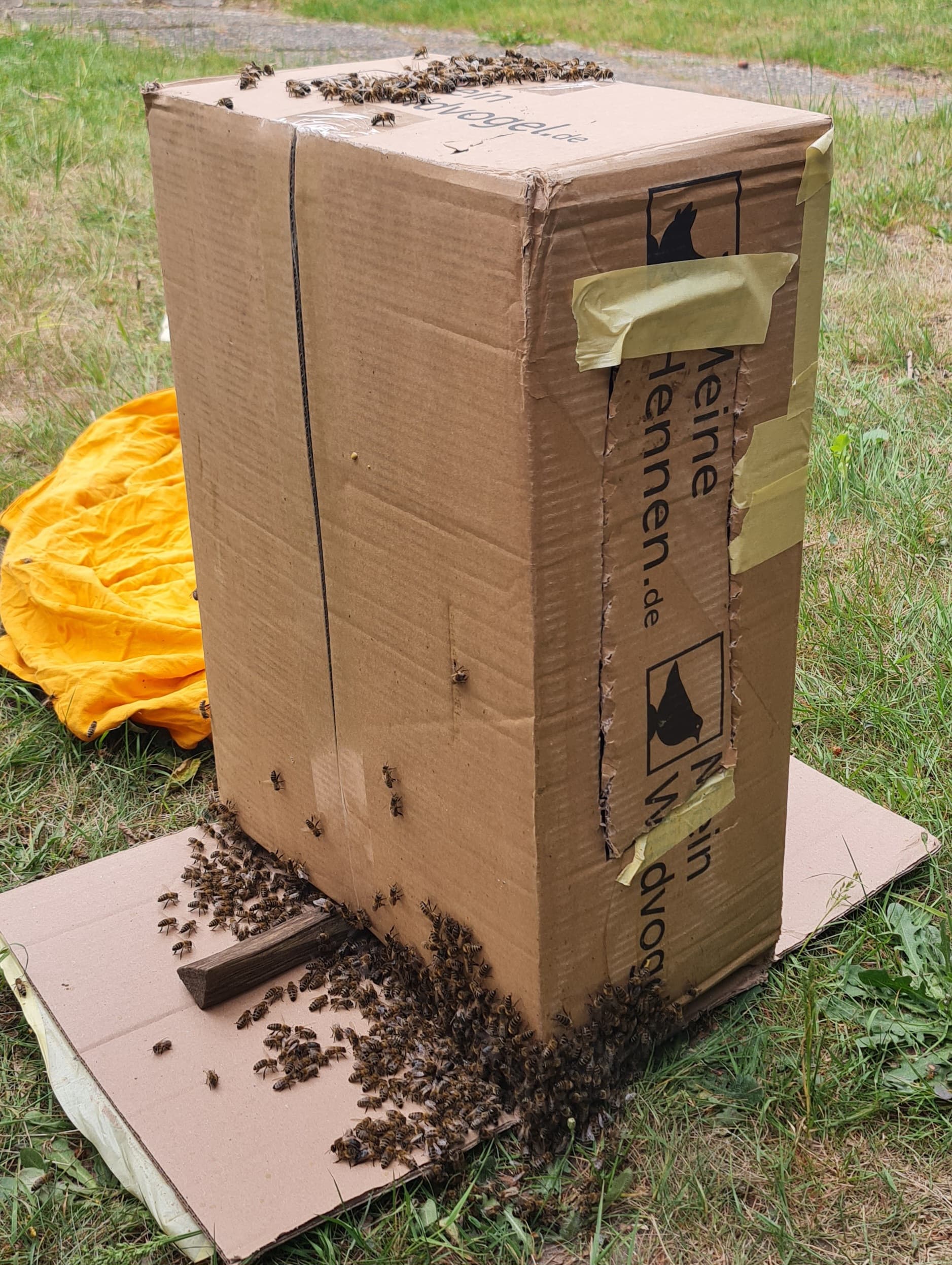 War er aber nicht, geschätzt ein Drittel war weg als ich wieder schauen kam. Und mir ein Haufen Bienen im Gras auffiel. Eine Königin und etwa 20 Getreue. Hab die aufgesammelt, in den Karton gesetzt und als ich 5 min später mit Klebeband zurück kam, war die Königin schon wieder draußen