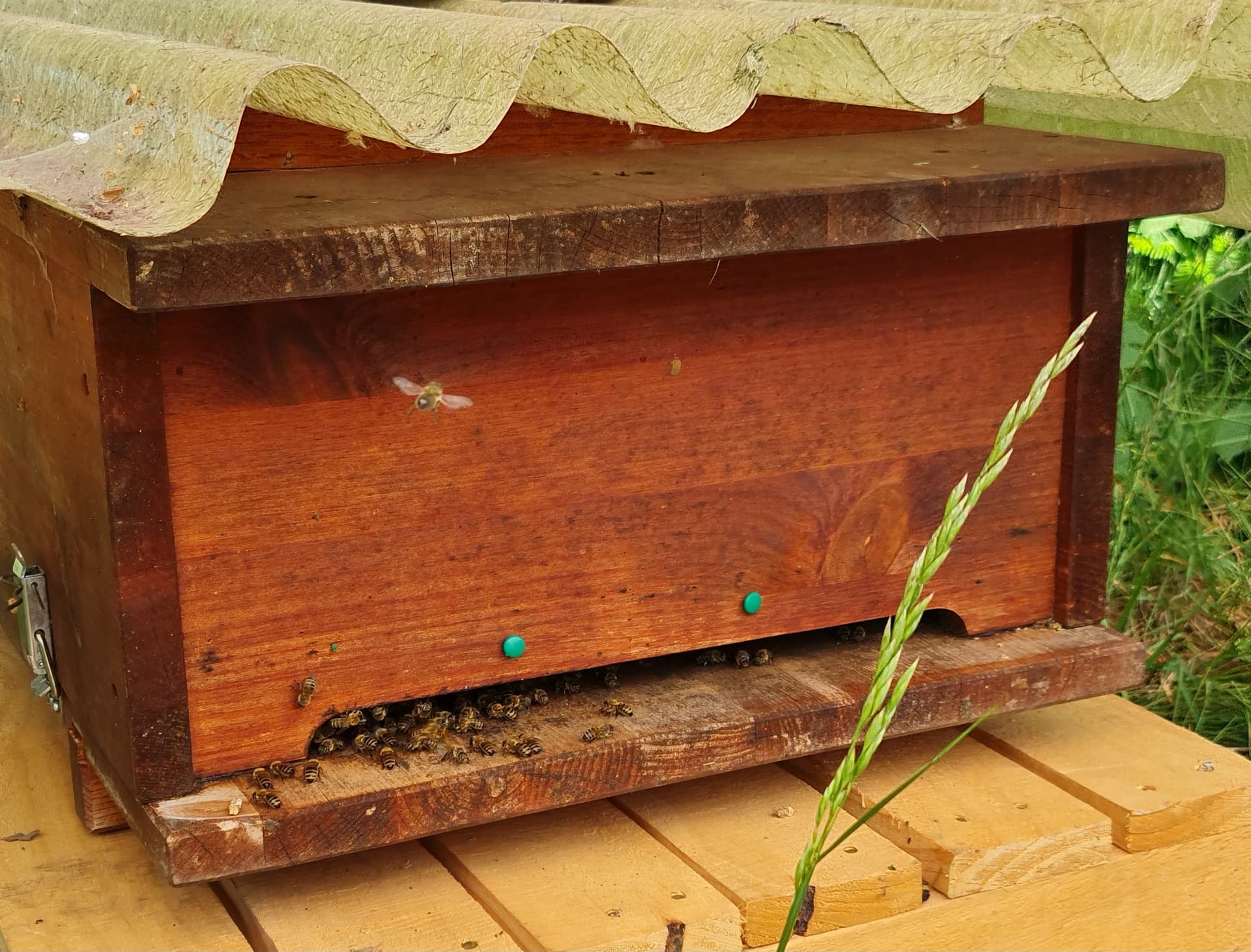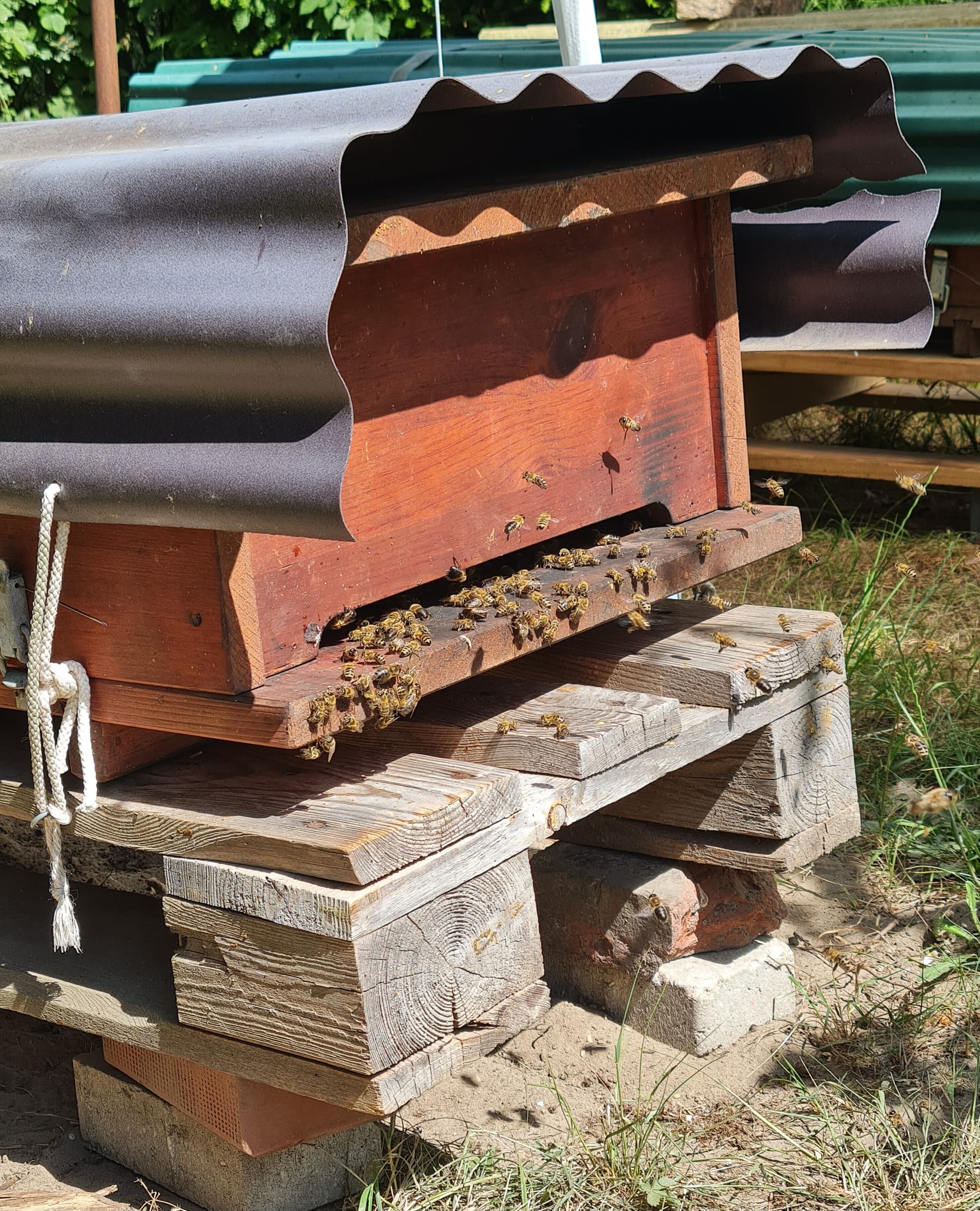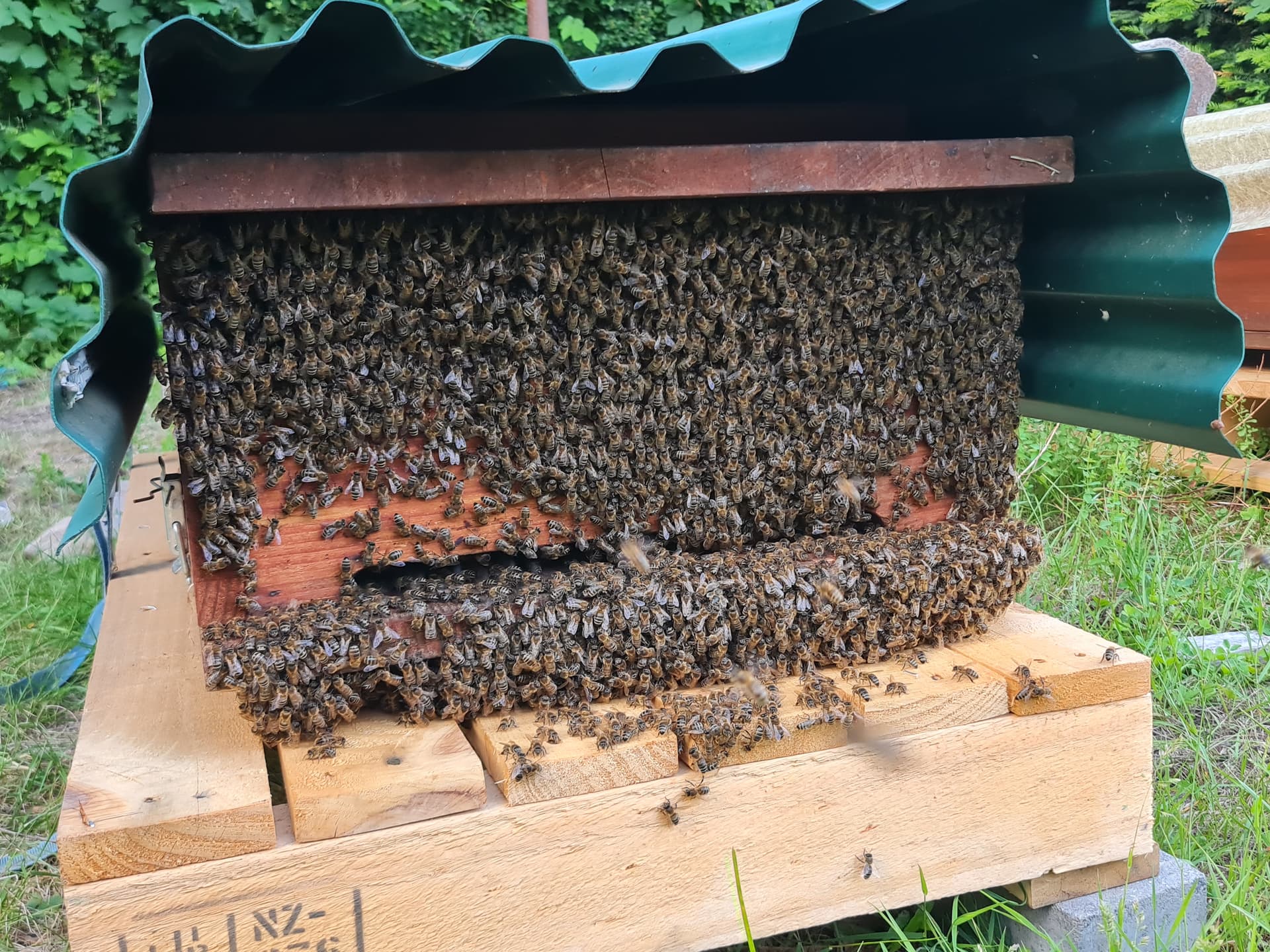 Team Grau hat auch gut zugelegt und ist jetzt bei 53 kg. Die Bienenmasse ist ein schöner Anblick, sie bauen im Brutraum jetzt die letzten Ecken aus, mehrere spitze Wabenkanten gesichtet. Dort wird das Schwärmen also wohl noch dauern, insgesamt mausert sich das Volk jedoch zufriedenstellend.