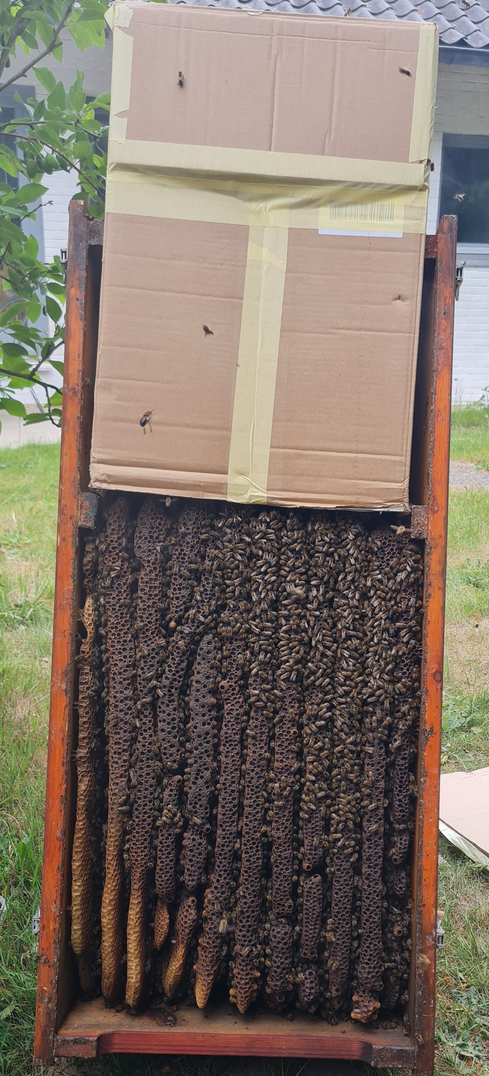 Doch Innen in der Kiste hatte sich leider Kleber gelöst, an einem Gazefenster war ein Loch, Bienen flogen raus. Ich hab das dann so neben die Biki gestellt und damit gerechnet, dass der Karton dann in einer Stunde leer ist.